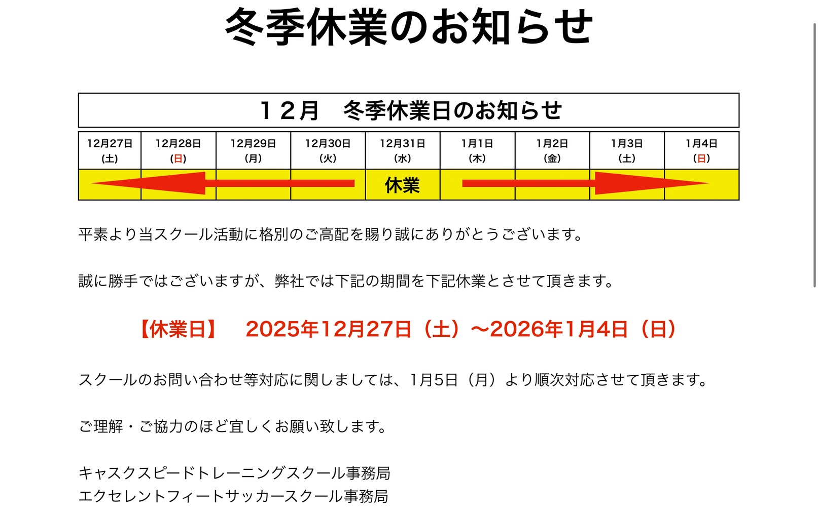 スクール体験お問い合わせ対応、およびキャスク道具販売における発送に関しましては、1月5日より順次対応させていただきます。